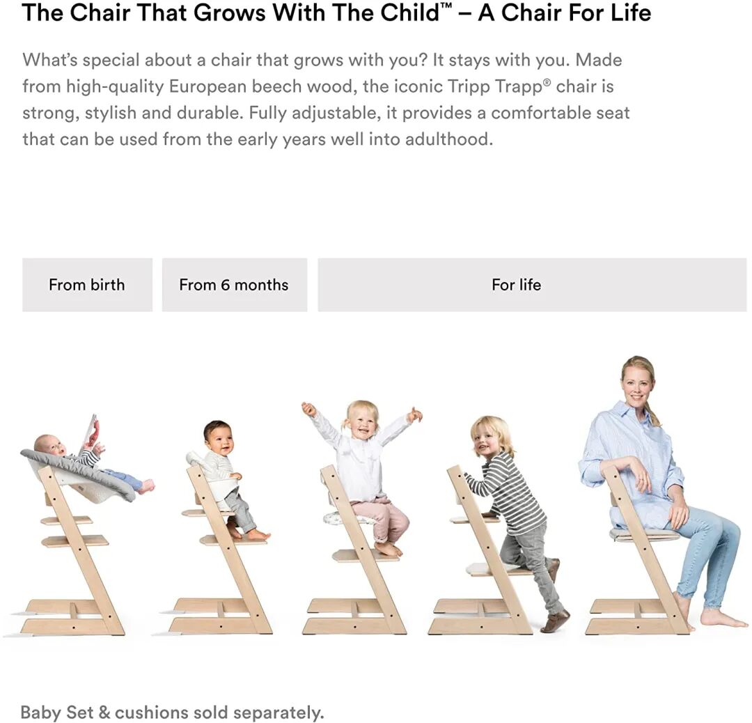 ▲宝宝刚出生的时候,椅子可以搭配newborn set变成一个小摇篮。等宝宝6个月的时候,椅子可以搭配baby set变成一把高椅,也可以购买配套的tray,训练宝宝吃辅食。如果不用tray,可直接把椅子推到桌子前,椅子的高度和深度设计特别合理,宝宝可以像大人一样坐在桌前和大人一起享受食物,增进亲子关系。等宝宝渐渐长大,去掉baby set将它变成一把普通的椅子。座椅板以及脚踏板的深度和高度都可以进行调节,提供足够的空间可以自由移动。只要正确调节,任何年龄的人群都可以达到符合人体工学的舒适坐姿。