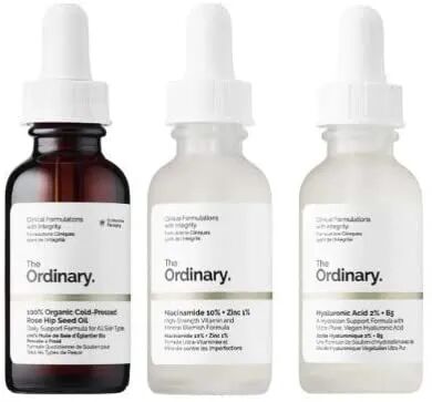 The Ordinary最近非常火,品牌旨在以合理的价格为市场带来有效的护肤品。三件套装直接包揽了三款最火的精华产品,冷榨玫瑰果籽油有助于减少疤痕,细纹,纠正黑斑,晒斑和肤色不均,还可以淡化妊娠纹。;透明质酸,结合高,中,低不同重量的透明质酸,深入到皮肤的不同深度进行补水。;烟酰胺,抑制黑色素的产生,同时帮助抵抗紫外线带来的晒斑,肤色不均和紫外线等皮肤损伤,还可以去除细纹,增加皮肤弹性。