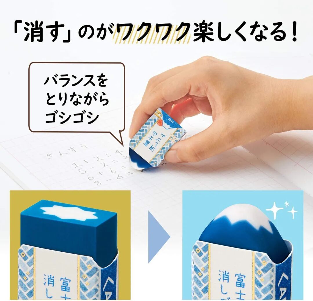 ▲PLUS推出的「富士山橡皮擦」,橡皮擦的颜色有红蓝两色,箔线包装,绘有市松,七宝等和风花纹,装点得着实可爱。
