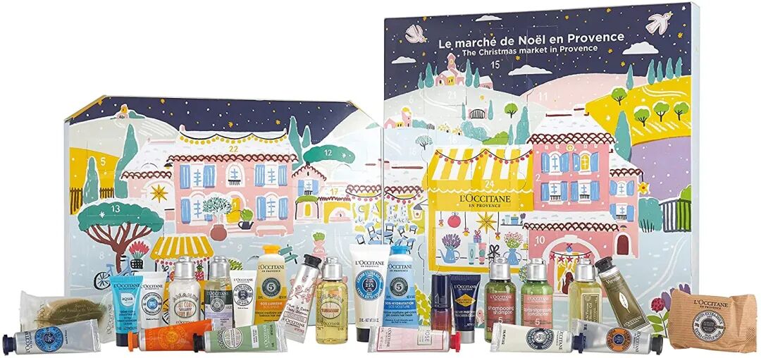 L'Occitane欧舒丹经典版日历礼盒设计成书本款式,封面采用小清新漫画的风格,著名的法国插画师Kanako将普罗旺斯典型村庄的节日圣诞气氛填充其中,插图描绘了圣诞节购物的乐趣,也是历年性价比比较高的倒数日历之一。24件单品,涵盖面部,身体,护发等各方面的热门产品,总价值远远高于售价。