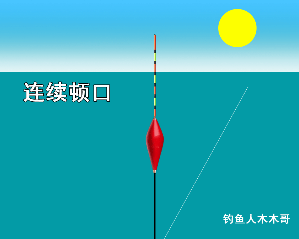 连续顿口也是中鱼率很高的一种漂像,钓鲮鱼(土鲮、泰鲮)还有鲫鱼时最常见到。连续顿口和小顿口差不多,鱼往下顿的目数不会超过一目,只会在半目之间来回的徘徊,你也可以把这种顿口理解为连续点动,就像蜻蜓点水一点一点持续点动好几下。以前我钓泰鲮时就遇到过这种连续顿口,那会对浮漂语言还不熟悉也没人教,见到这样的动作就没打,一直是手抓着鱼竿眼睛盯着浮漂等着黑漂,结果饵料吃没了都没黑漂,后来在不经意的提竿既然中鱼了,还是正口!才发现这连续顿口是可以打中鱼的,然后就开启了我钓土鲮、泰鲮的辉煌之路。