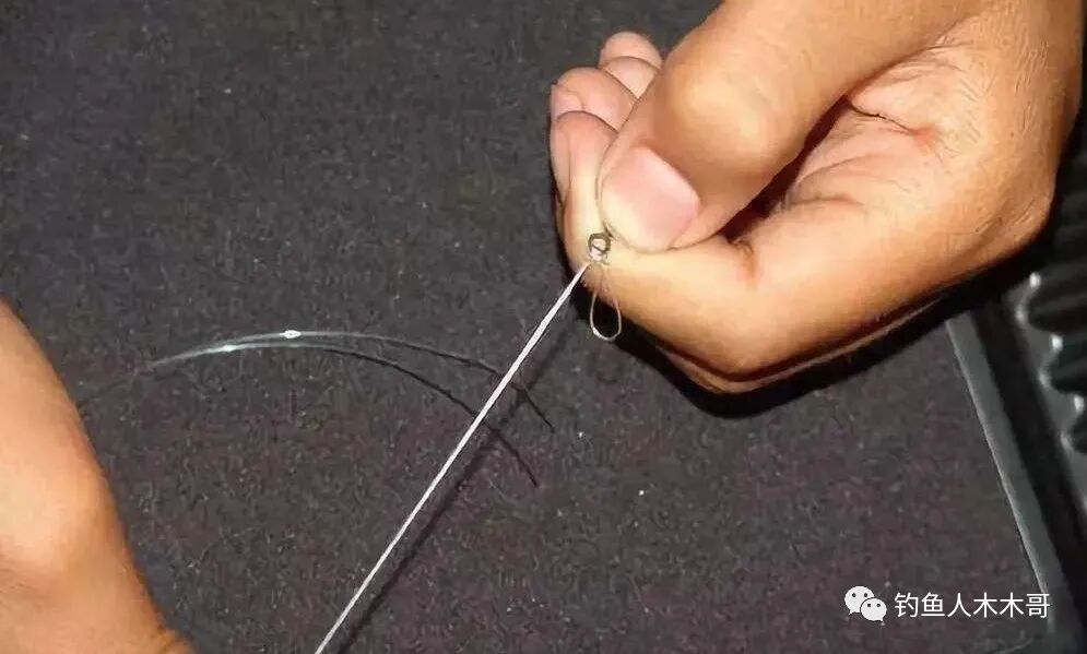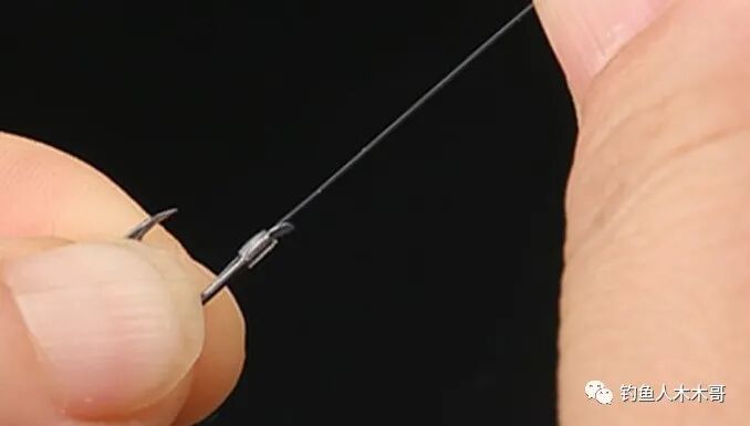 绑完了鱼钩,接下来就到打子线结和连接8字环这一步。打子线结分为单结和8字结,两种方法单结适合垂钓小型鱼类,如鲫鱼、还有一些一两斤的鲤鱼也可以。8字结就比较适合钓大鱼。打子线结的时候注意,为了避免子线拉紧受伤和卷曲,在打结时可以抹点口水起到顺滑的作用,这样打出来的结才不易受伤。