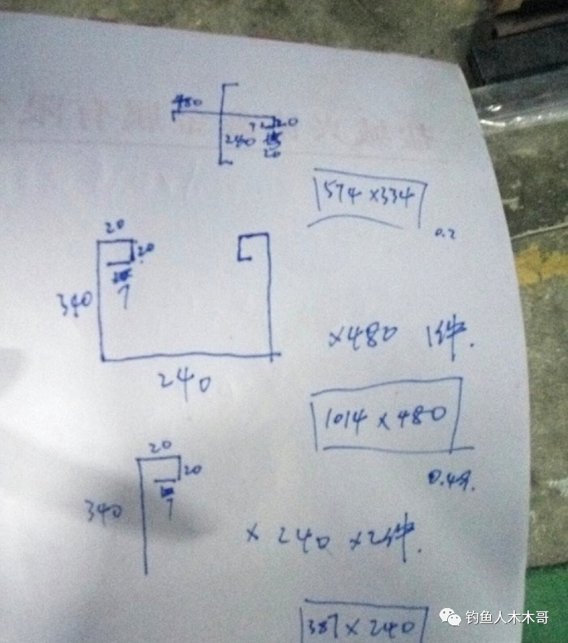 1、虽说钓箱不是什么高科技的东西,但该有的程序那不能少,图纸和尺寸得先画好。这些数字我看不懂,因为俺数学方面不好,上学那会数学作业没少吃鸭蛋!