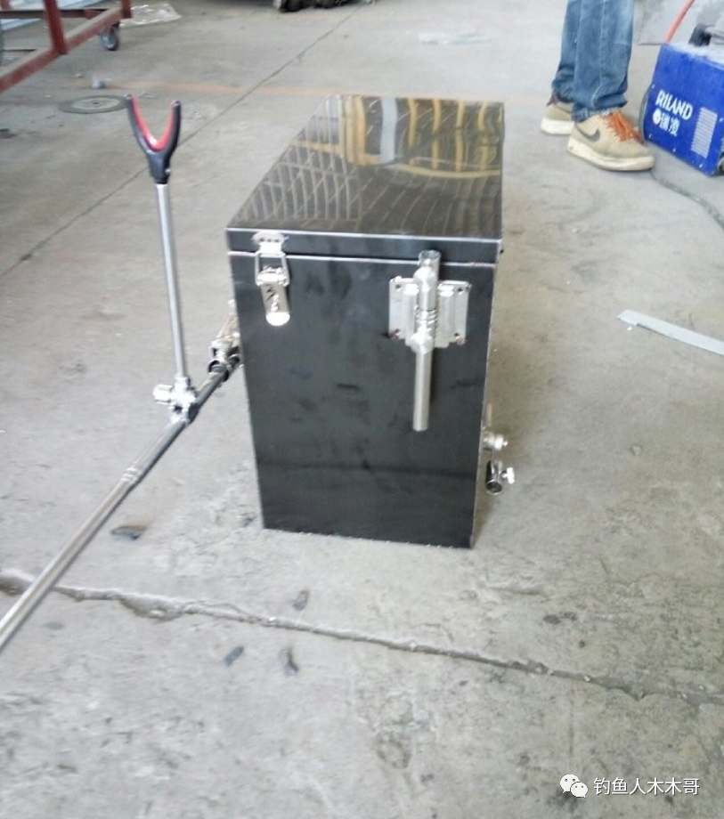 3、整个箱体焊接完,接下来就把需要的配件给它装上去,炮台架、饵盘架等,到这块这个不锈钢钓箱基本成型,大小跟我那个35升的钓箱差不多。
