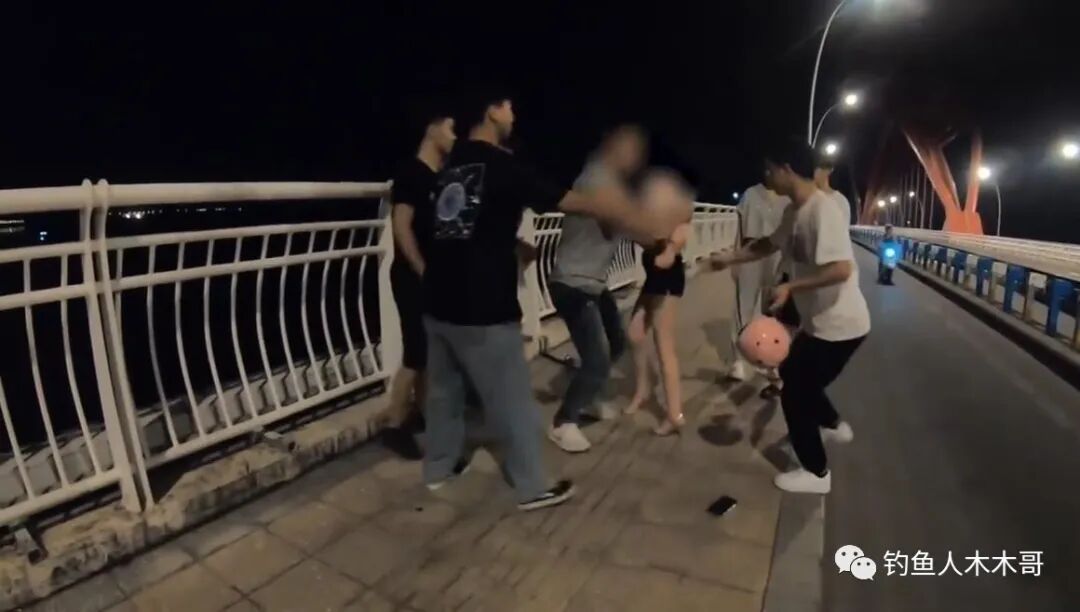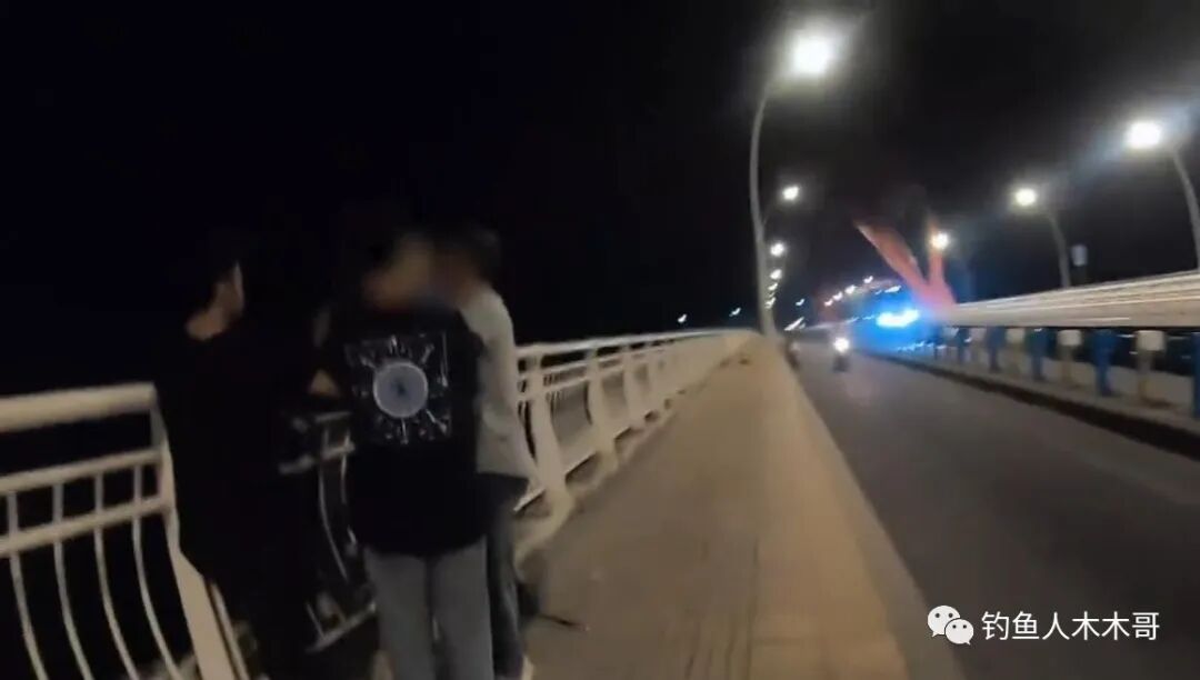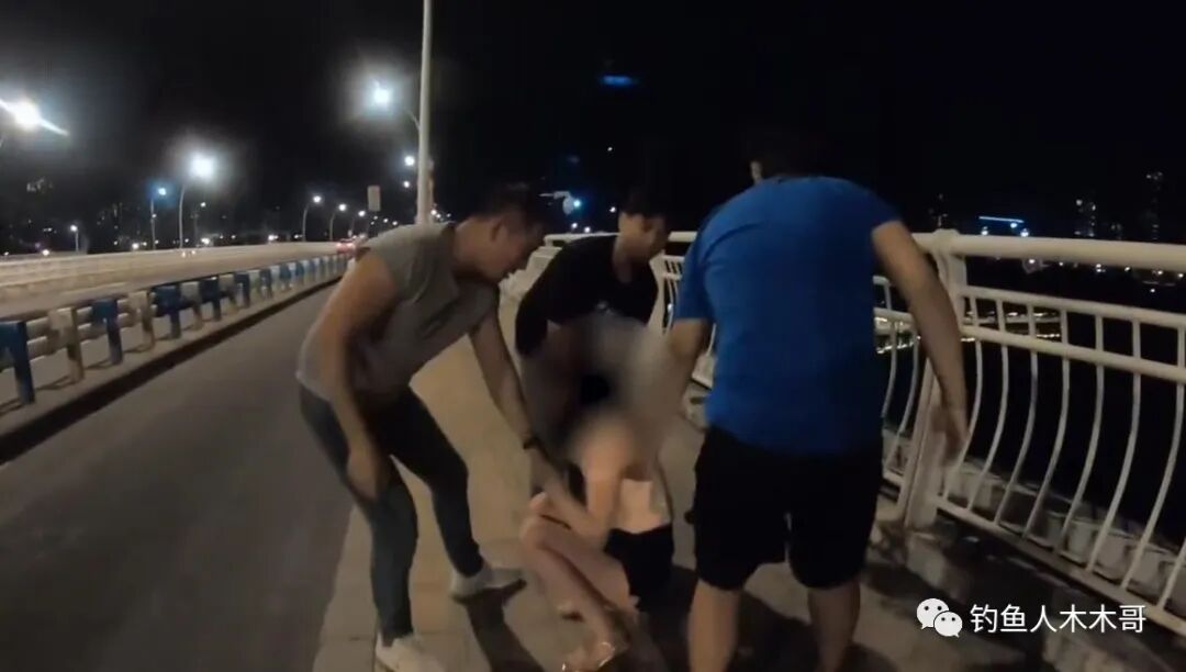 没过一会女子翻上了桥上的栏杆,一只脚已经跨到了栏杆之外。这时离得较近的两位钓鱼小伙飞身上前将女子拉住,其他钓友也纷纷赶来支援,几个人合力把女子从围栏上拖了下来。