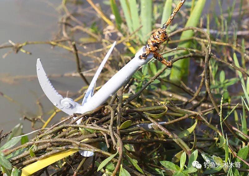 三爪钩的作用也很大,这主要是应对钓位水面杂物,还有水底杂草烂树枝。在北方的钓鱼人,大部分包里都会带着,因为河段很多地方不清理都没办法下竿。干净的地段没鱼,有鱼的地段水面都是水草,只能用三爪钩清理。