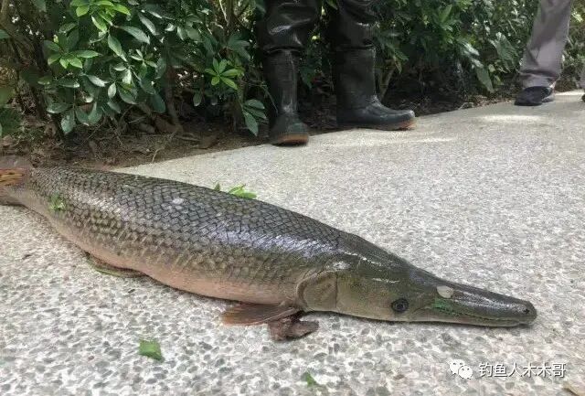 这条鱼的身子呈圆柱形状,足有一米多长,最特别的地方就是它的嘴巴,我们熟知的鱼类大多嘴巴很短,而这条鱼不同,嘴很长就像鸭嘴。