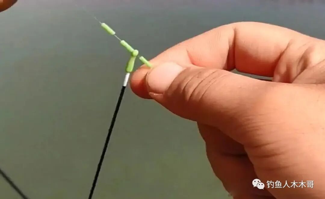 6、接下来双钩挂上饵料找底,如果挂上饵料后浮漂全部没入水中,就应该上推浮漂。当漂露出水面1目左右时,说明下钩饵已经到底,而且此处是最灵点,用最下面的那颗太空豆固定此位置。如果双钩挂饵后,浮漂还露出水面有目数,比如还露出1目,则最灵点就在1目多一点的位置,这种情况下,可用于钓浮。
