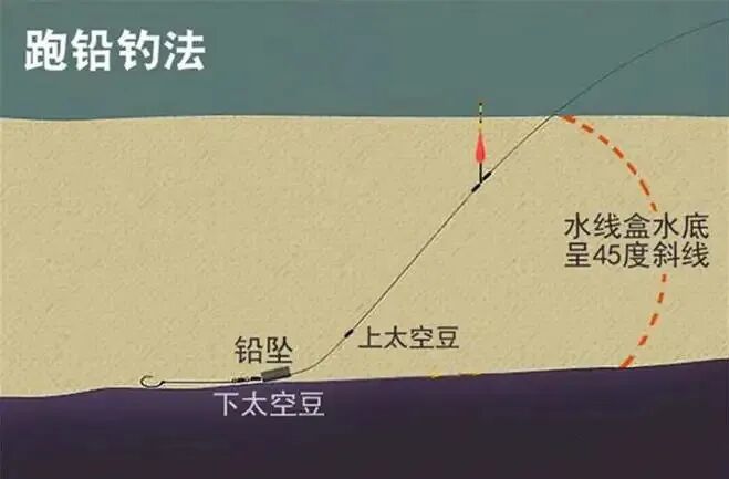 跑铅钓法精髓在于铅坠躺在水底,利用自身的重量让线组钩饵保持一个不动的状态,操作时将锁住铅座的太空豆拉开一定距离,让线能在线上来回滑动,当有鱼咬钩以后,拉动线组时铅坠成一个固定不动的状态,浮漂就会出现信号,这就是跑铅的一个基本作用。