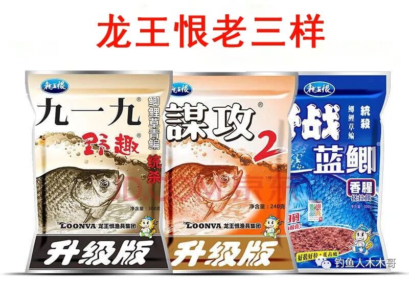 接着我们来看龙王恨推出自己的老三样,他们还起了一个名字叫新三样!三款饵料搭配有:野战蓝鲫、919、谋攻2号。看到这些名字你是不是有点怀疑自己的眼睛,你没看错他们就起了这样的名字,老鬼的叫918他就叫919,速攻2号他就叫谋攻2号!从名字上就能看出是在竞争,要不没谁会起这样接近的名字。至于龙王恨的老三样钓鱼如何这里我就不加赘述了,这得钓友们自己亲自去验证。