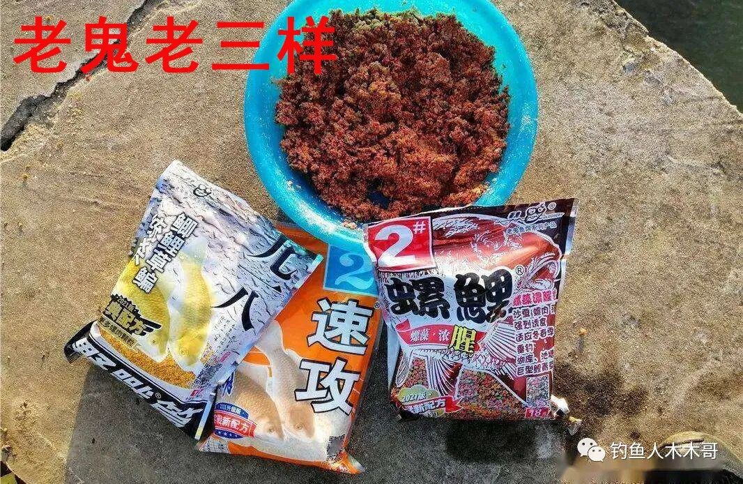首先来看老鬼推出的老三样,他们三款饵料的搭配是:螺鲤、918、速攻2号,用螺鲤替代了龙王恨的野战蓝鲫,三款饵料都是自己家生产的产品。这里说明一点,螺鲤也分为三个味型版本,螺鲤1号(螺肉)香,螺鲤2号(浓腥),螺鲤3号(酒香)。推出这么多款有两点原因,一呢供钓友们随时调配合适的味型,二呢不说大家也知道,是为了增加销量。一般老鬼老三样用到的多为2号螺鲤,其他的效果不是很理想。