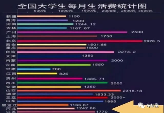 从这张晒出来的月消费榜中,可以看出从七级到一级的贫富差距太过悬殊。具体哪些地方的大学消费相对高一些,哪些地方会低一些呢?从下面这张图里可以很容易看出来。