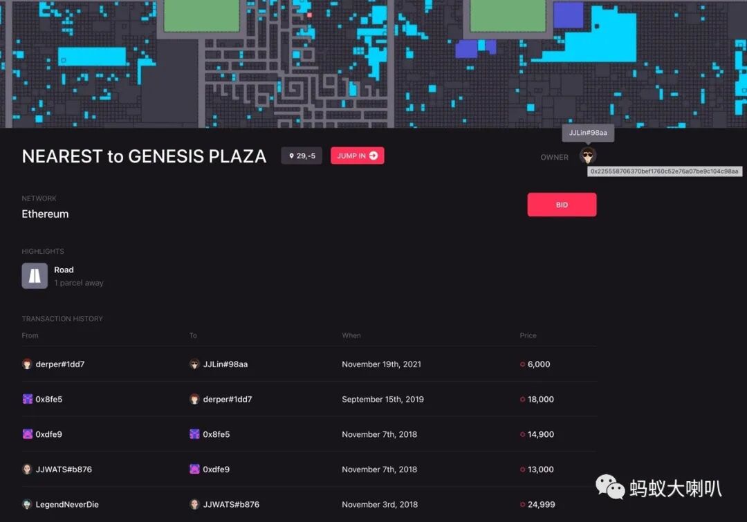 再看了下其中一块“Nearest Genesis Plaza”的信息(↓下图),在今年11月19号以6000个Mana(当前1个 Mana 约等于 $5美刀)也就是$3w美刀购得。