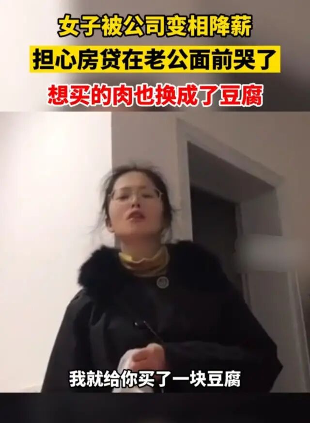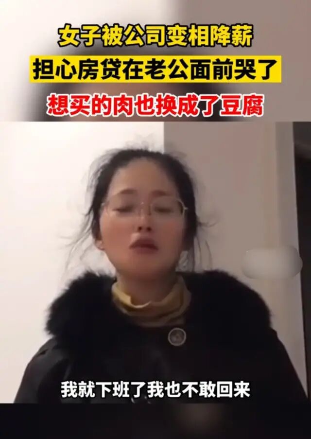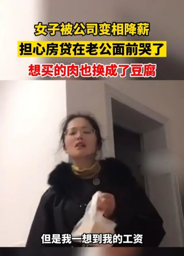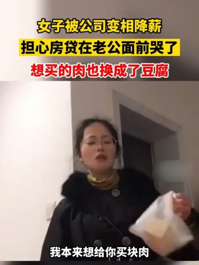 “他们说全员都加薪了,但是他们领导工资高,我们是已经是最低的工资了,他还给俺降,我就特别害怕。我想着咱的月供,我就给你拖后腿啦,下班了我也不敢回来,我就一直在那坐着,我一个人就跟着办公室哭,也不敢让人家听见,觉得我可没出息。我本来还想着给你买块肉吃的,但是我一想到我的工资,我就只能给你买了一块儿豆腐,你先将就着吃,呜呜呜。”
