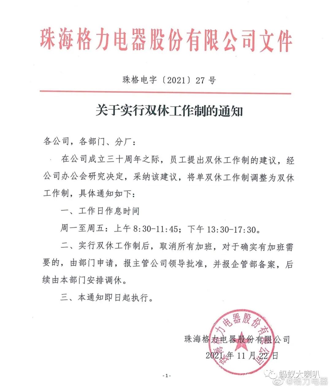 11月22日,格力电器发布内部通知称,在公司成立30周年之际,有员工提出双休工作制建议,经公司办公会研究决定,采纳该建议,将单休工作制调整为双休工作制。适用范围为格力电器旗下的各个公司、部门和分厂。