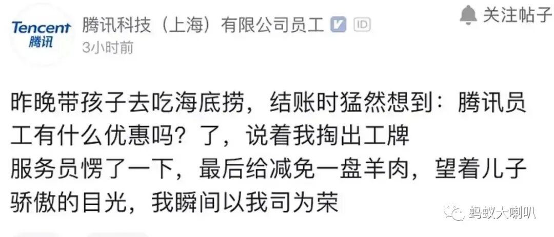 无独有偶,近日认证为腾讯员工的发帖:昨晚带孩子去吃海底捞,结账时猛然想到:腾讯员工有什么优惠吗?说着我掏出工牌,服务员愣了一下,最后给减免一盘羊肉,望着儿子骄傲的目光,我瞬间以我司为荣!