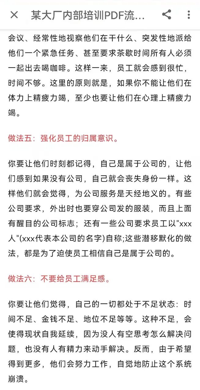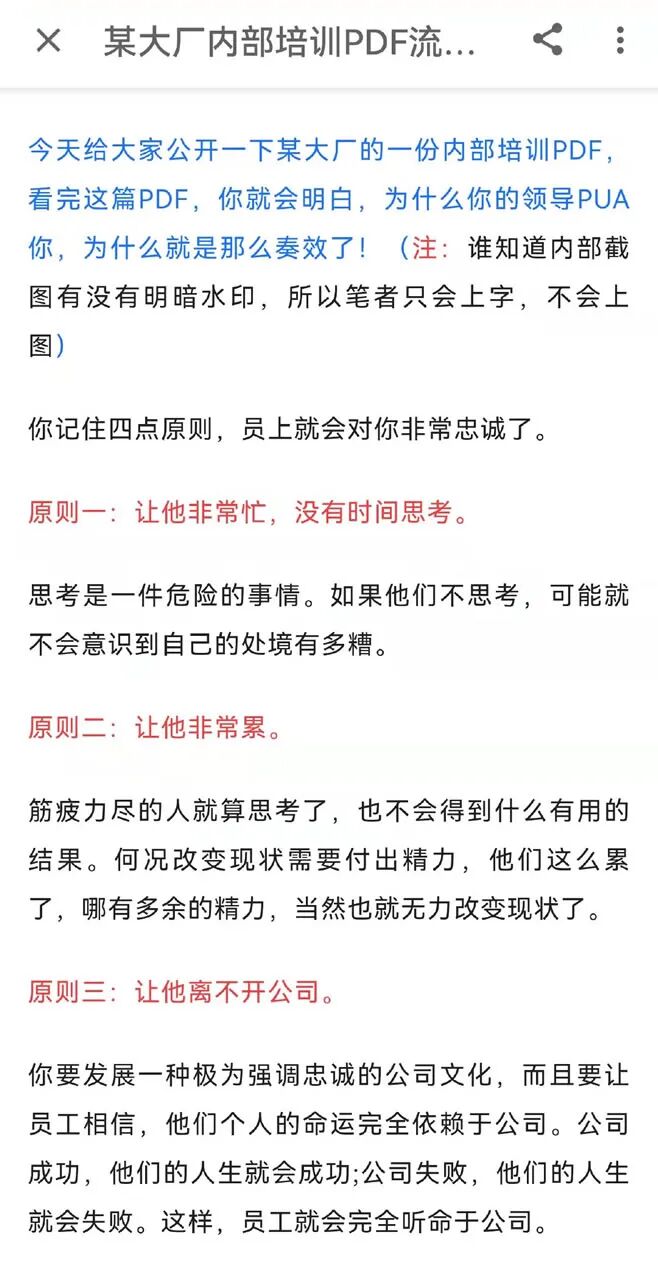 网上流传了一份据说是某大厂的内部培训文件,详细讲解了对员工的PUA流程,总结下包括4点: