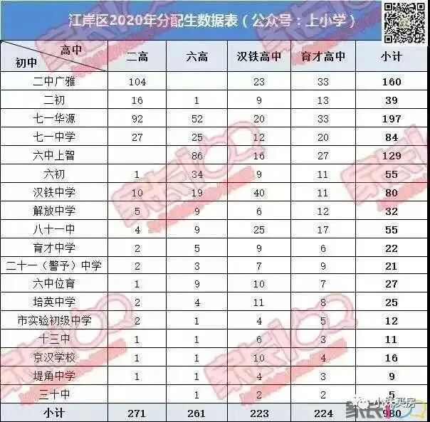 除了普高率和示范率之外,优质高中的分配生是初中实力的一种表现。在武汉九大名高中,江岸区独占2个:二高和六高,其给予区域内初中的分配生比较多,再加上育才高中和汉铁高中两所重点高中的分配生名额,2020年,江岸区分配生名额有980个,数量相当可观。