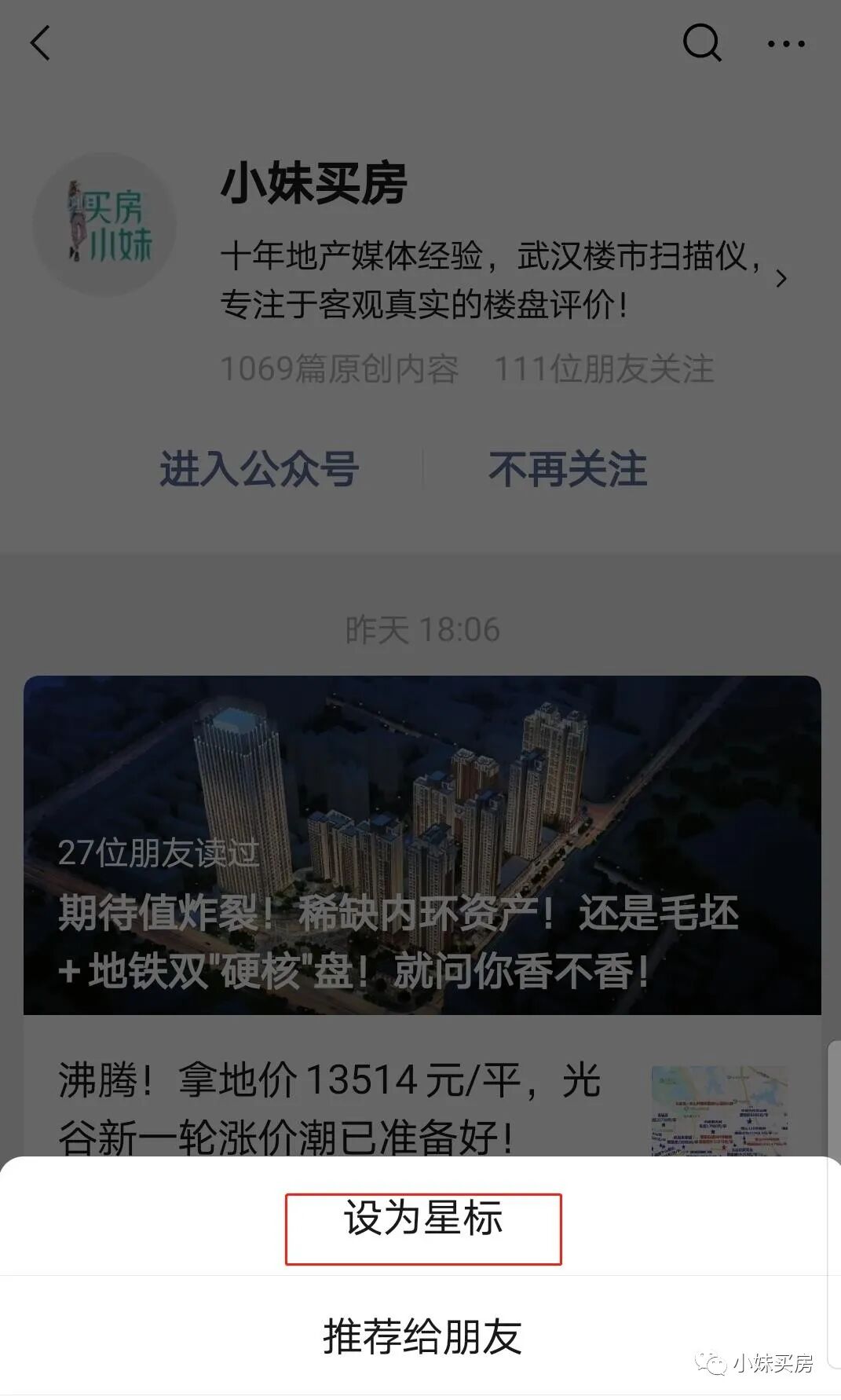 1、点击【小妹买房】公众号,设为“星标”: