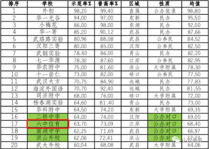 在2020年武汉中考平均分排行榜前70名中,就有10个是江岸区的(平均分排名仅供参考,具体还是要看升学率),六中位育是区域内公办学校平均分最高的。