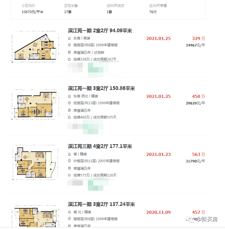 滨江苑二手房均价约3.3万/平,一期建筑年代在1999年,二期在2004年左右,房龄近20年,户型面积90多平到200多平都有,仅有17套在售,近期成交了3套,150平左右的总价基本在500万以内。