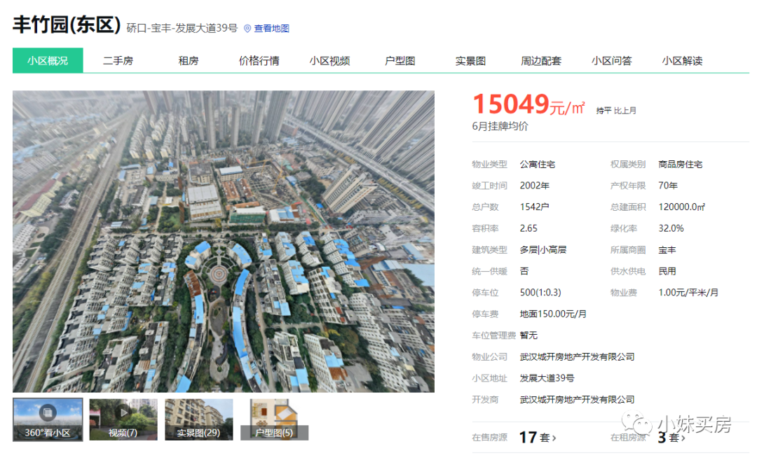 其中大一些的丰竹园分东西区,小户型比较多,是房龄近二十年的步梯房,总楼层为六到七层,二手房均价约15049元/平。
