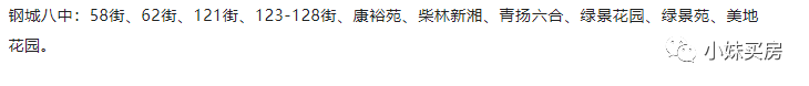 钢城八中:58街、62街、121街、123-128街、康裕苑、柴林新湘、青扬六合、绿景花园、绿景苑、美地花园。