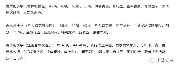 吉林街小学(江南春城校区):39-41街、44-46街、新奥依江畔园、联泰香域水岸、青山印、青山樽、开元公馆、东兴天地E区、江南春城、南洋金谷、碧苑C区、39大街、吉庆苑、苗圃宿舍、新长江世纪坊、新长江青源。
