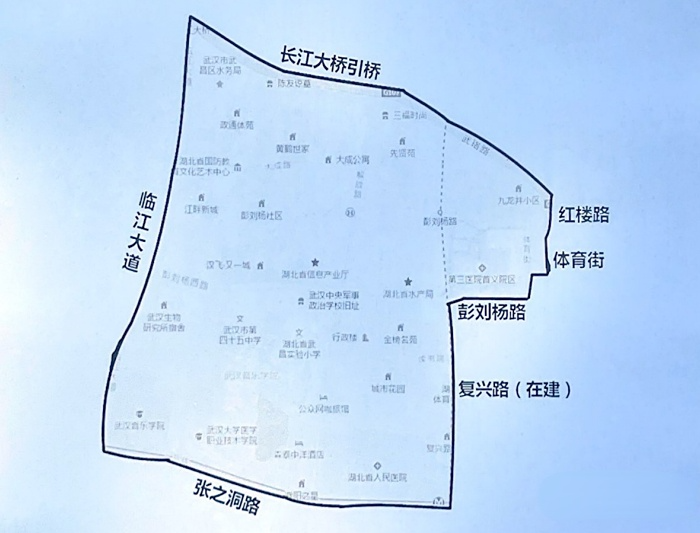 张之洞路280号(欣隆·紫阳苑)千家街4号千家街8号(千家街50号育才高苑、千家街6-16号育才公寓)千家街18号金涛铭座(中山路368-374号金涛铭座)千家街24号(千家鑫苑)千家街30号千家街1、3、5、6、11、15、20、77、79、81、83、85、105109、203、205号千家街62-78号(双号)中山路3B0-446号(双号)、张之洞路275号、张之洞路284号、张之洞路286、288号、张之洞路268号、中山路450号、武路路57号、93号、114号、千家街1-76号、大东门铁路小区、大东门三村1-5号、大东门四村1-24号、中山路487号(南国·新东城)、中山路499-515号、中山路495、497、517、519号
