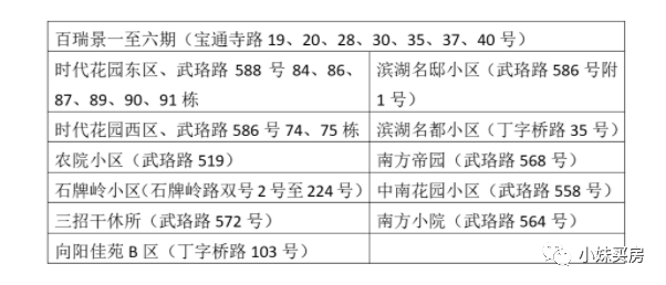 友谊大道194号 阳光水岸、中山路145号 建行宿舍、友谊大道13号 友谊国际一期、中山路22号 大唐宿舍、友谊大道3-11号(单号)黄房子小区、沙湖苑路18号 沙湖苑小区9-11栋、公平路45号 尚隆地球村、紫荆村170-178号原老公安分局宿舍、公平路21号 省中医院宿舍