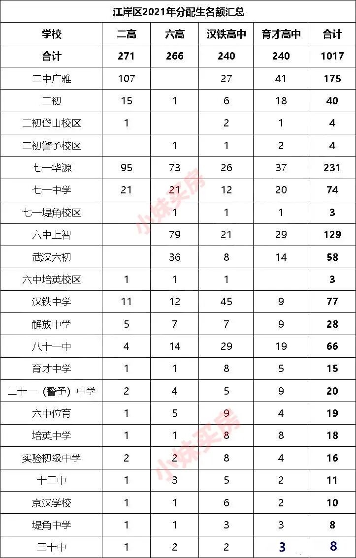 在武汉九大名高中,江岸区独占2个:二高和六高,其给予区域内初中的分配生比较多,再加上育才高中和汉铁高中两所重点高中的分配生名额,2021年,江岸区分配生名额有1017个,数量相当可观。