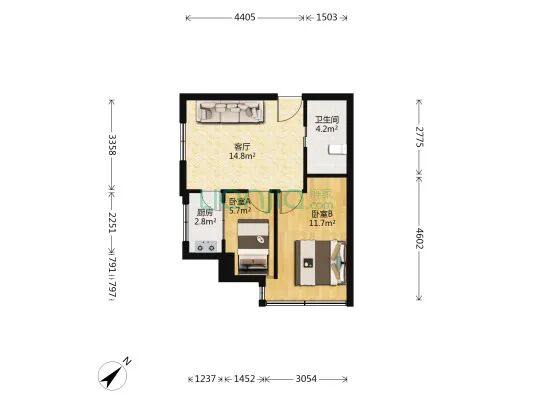 这套建面约66.59㎡的一室一厅一厨一卫,售价314万。链家户型图如下: