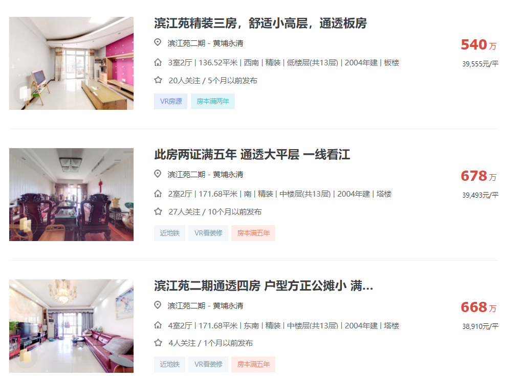 滨江苑二手房均价约3.7-3.8万/平,一期建筑年代在1999年,二期2004年左右,房龄近20年,户型面积90多平到200多平都有,有44套房源在售,近期90天成交了1套,150平左右的总价基本在600万左右。