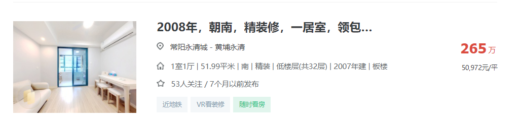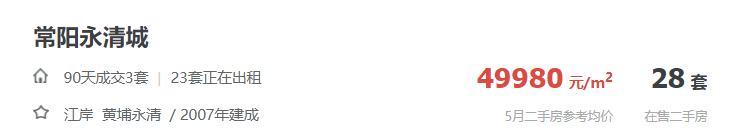还有另外一种选择就是单纯的XQ房需求,不考虑长期居住,还可以选择常阳永清城,均价约4.9万/平,小户型成交价比较高,单价5万/平左右,一室一厅总价可以控制在260左右。