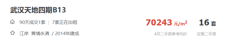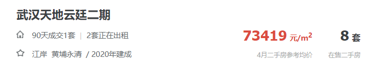 房龄最新的是五期武汉天地云廷,户型为250平以上的大平层,二手房均价7.3万/平,成交总价都在千万以上;
