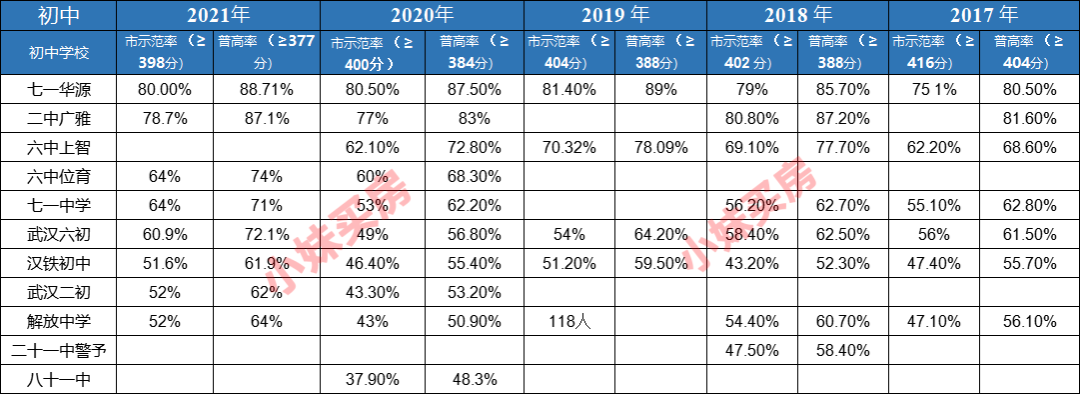 从普高率和示范率来看,2021年江岸区初中排名为:七一华源、二中广雅、六中上智、六中位育、七一中学、六初、二初、解放中学、汉铁初中。