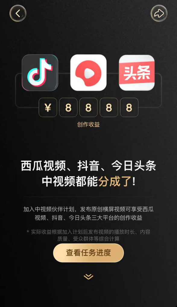抖音+西瓜+头条联合成立了一个中视频计划,只需简单的拍横视频就能撸钱。