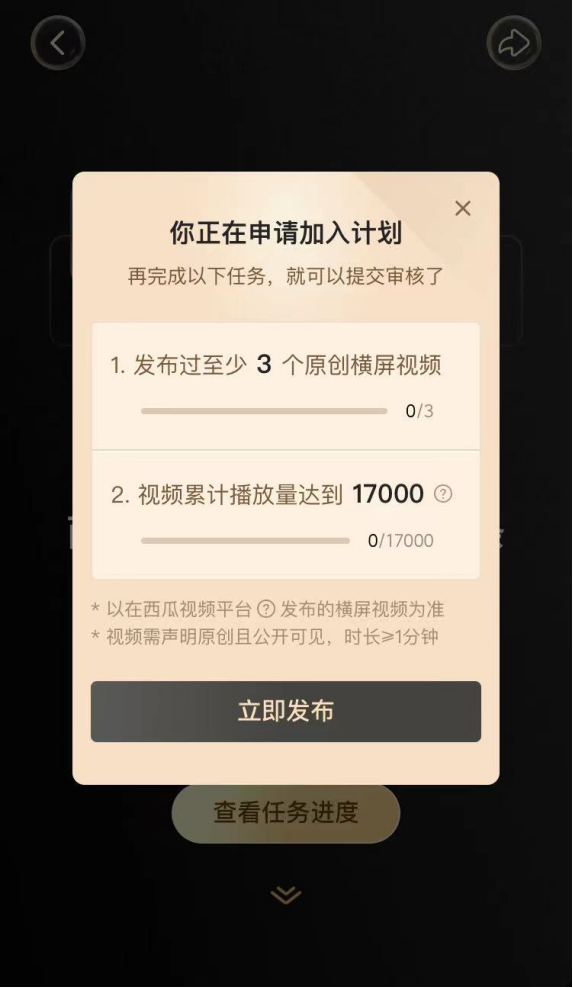 简单的讲,要开通这个计划,只要通过西瓜视频发布3条原创视频,并且总播放量达到1.7W即可。