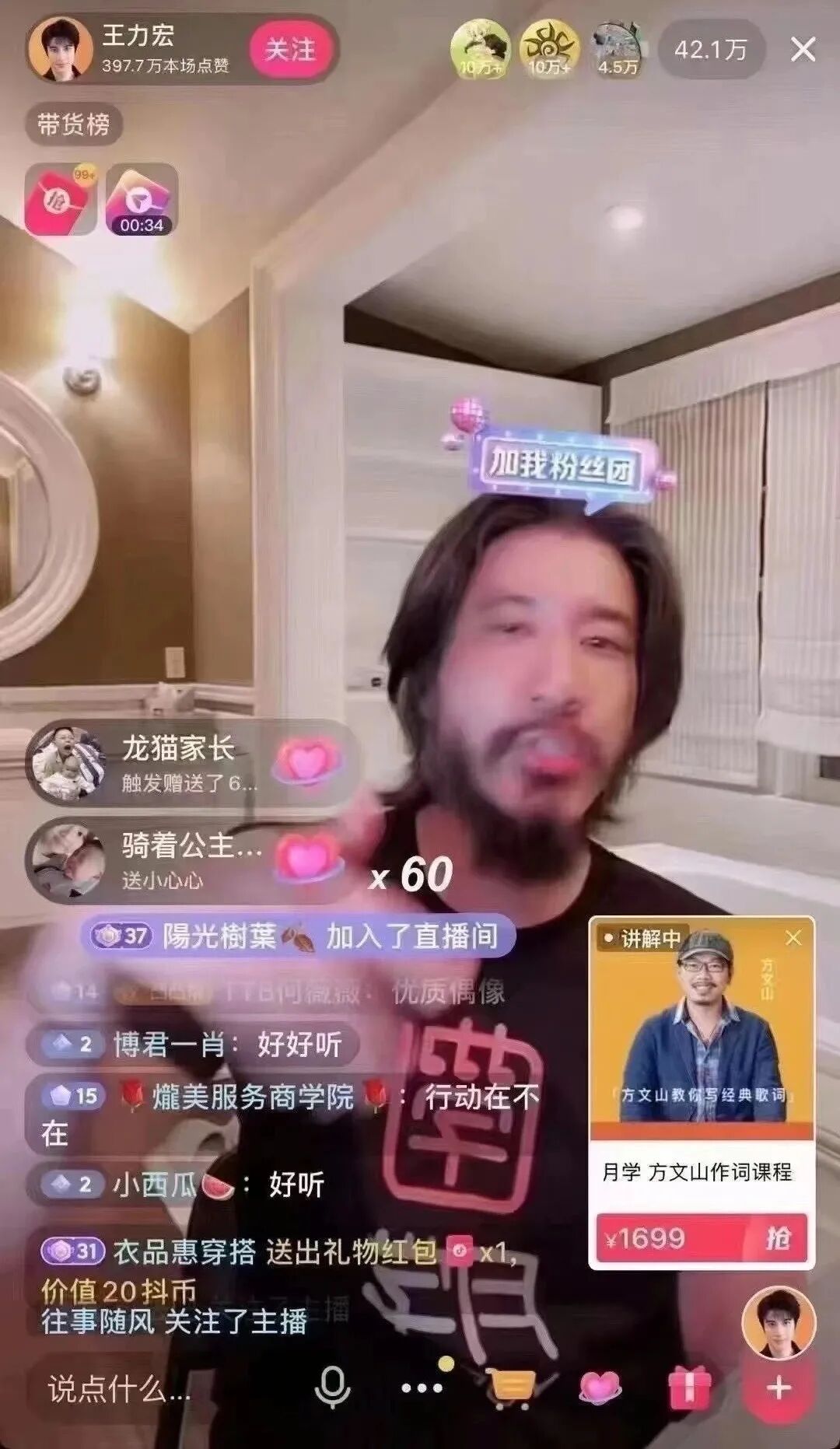 他的变现模式跟王力宏一样,也是靠直播卖课。