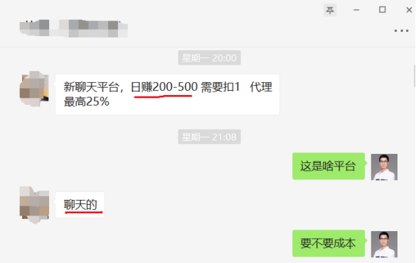 前天晚上8点,他又给我发聊天平台,能达到日200-500块。