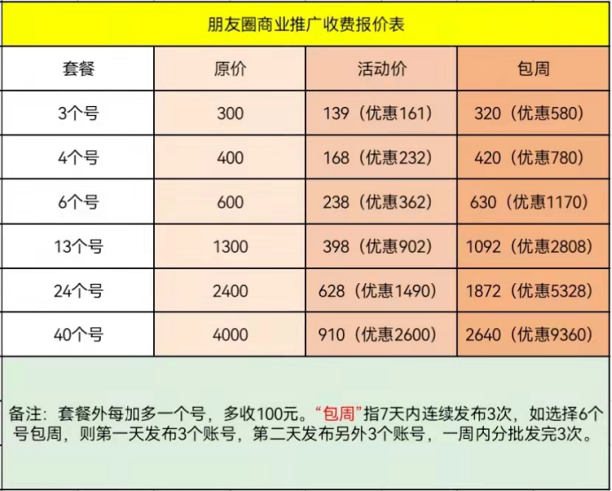 根据客户要推广的个人号数量来计费,平均一个号收费100块,最多40个号同时推就是4000块,推送不是一次性,而是每天发几个号,直到完成客户所要推的账号数量为止。