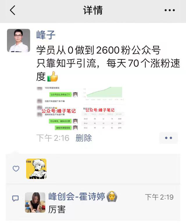像这个学员,做的是大学生粉,前期就靠知乎写各种资料内容,现在每天公众号自然增长70+粉丝以上,整个操作不花一分钱。