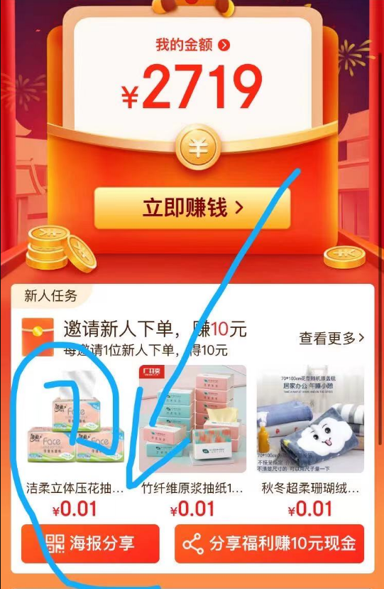 这个项目的逻辑是这样,邀请新用户1分购,免下载,推广人拿10元佣金。