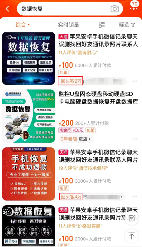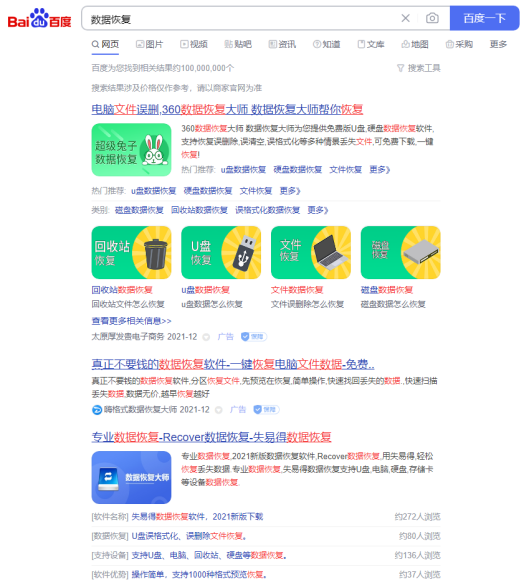 无脑通过百度搜“数据恢复”,会优先展示投竞价推广的网站。