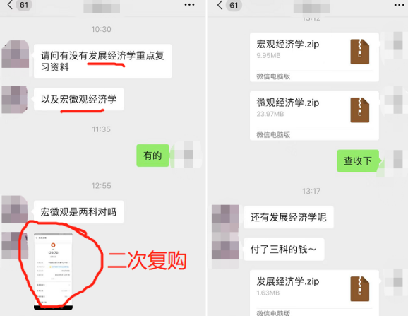 转化率和复购率都很高,比如这个学生就是典型的例子,第一次买了农业经济学的复习资料。