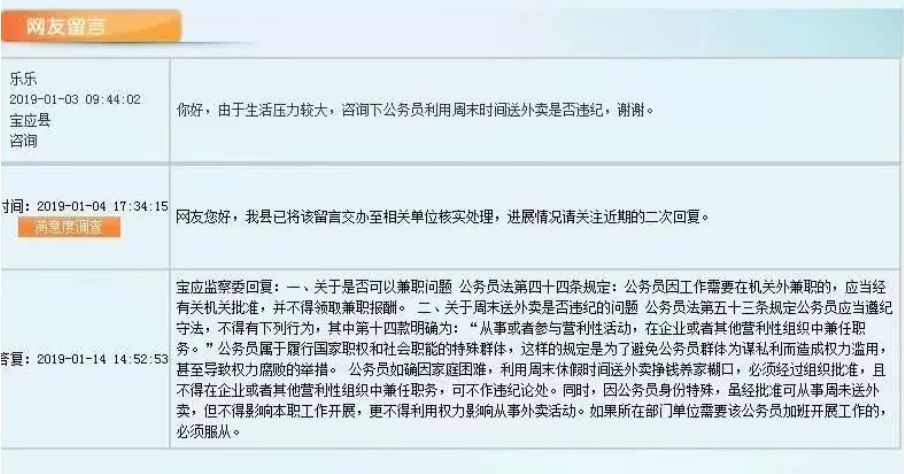 2019年1月3日,有宝应县公务员“乐乐”询问当地监察委:“由于生活压力较大,咨询下公务员利用周末时间送外卖是否违纪”。