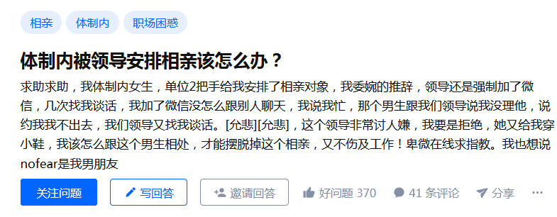 知乎上有个问题,体制内被领导安排相亲该怎么办?答主“南柯太守”回答很好,特申请转载,给大家参考: