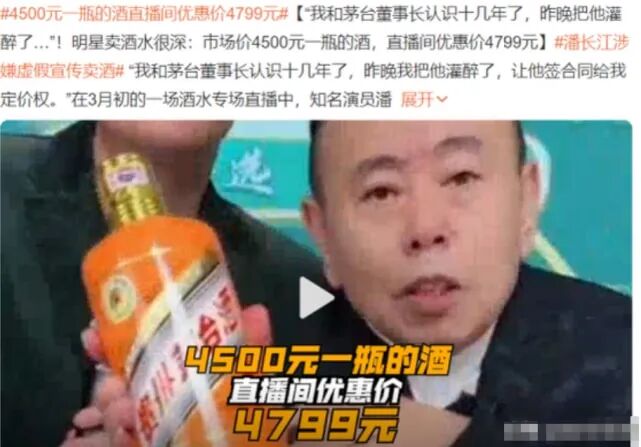 事情的起因,还要从他三月初的一场带货直播说起。 那天,他在介绍一款知名品牌白酒产品时,使用了一长串夸张的营销话术,声称为直播间观众争取到了低价福利,将这款标价4799的白酒吹得天花乱坠,诱导消费者下单。 然而,很快便有网友发现,这款白酒的市场价实际为4500元,潘长江所谓的“折扣”和“福利”,根本就是无稽之谈,这近300元的差价,大概流进了他自己的腰包。