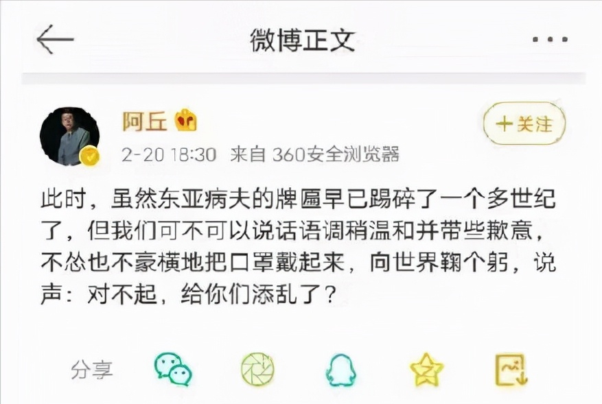 虽然事后阿丘删除了微博,并向公众进行了道歉,但把国人比作东亚病夫,又在疫情源头未明确的情况下给中国人抹黑,阿丘骨子里的“奴性”,面对西方国家卑微、懦夫的态度着实让人鄙夷。