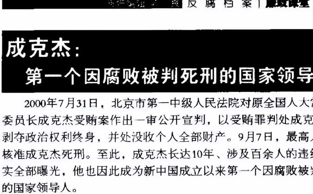 2000年7月31日北京市第一中级人民法院宣判,以受贿罪判处成克杰死刑,剥夺政治权利终身,并处没收个人全部财产。